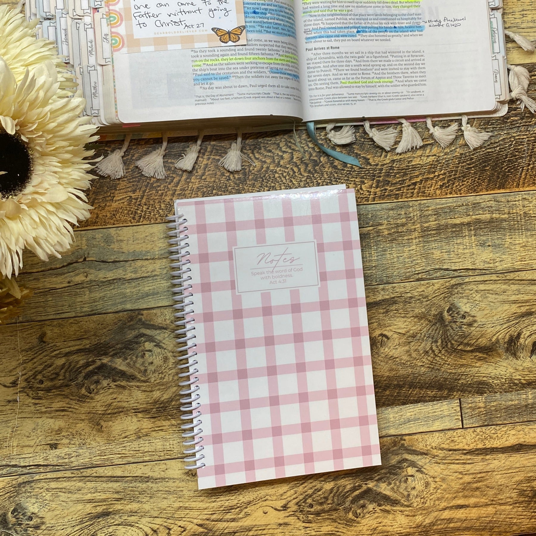 Pink checkered notebook held by a hand on a wooden surface with sunflowers and another notebook in the background.